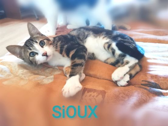 Voilà ce que sa famille d'accueil dit de lui : " Sioux est super sociable : pas peureux, très affectueux, proche de l'humain, un vrai pot de colle. Il est aussi très actif et joueur. Il a la queue tordue ce qui fait de lui un chat unique. "