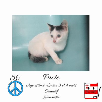 Pacte est un mâle de 3-4 mois craintif (un comportement normal en fourrière) qui vous attend dans une fourrière du 56. ATTENTION SORTIE AU PLUS TARD LE 24/09/2021 (avant euthanasie) !