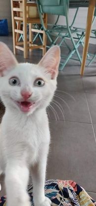 C'est un chaton couleur red point, ( blanc avec du roux aux yeux bleus ) il est très câlin et très bavard, il a besoin de beaucoup de contact donc adoption avec un autre chat indispensable. Il est très curieux et très très ronronneur.