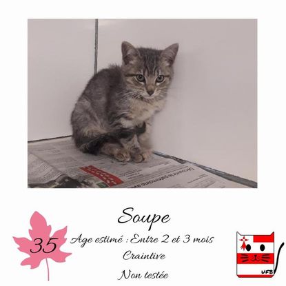 Soupe est une femelle de 2-3 mois craintive (un comportement normal en fourrière) qui vous attend dans une fourrière du 35. ATTENTION SORTIE AU PLUS TARD LE 01/10/2021 (avant euthanasie) !