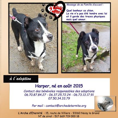Harper est arrivé en famille d'accueil le 30 octobre, il s'est montré très sociable envers toutes les personnes présentes. Très gourmand aussi. A la maison, il a un bon caractère et il s'est bien entendu avec les 2 autres chiens.