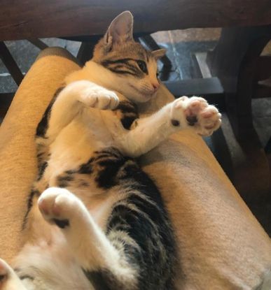 Elle fait rapidement confiance, on peut la prendre et la caresser, elle ronronne instantanément.