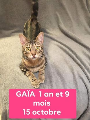 Jeune chatte tigrée à caractère calme et réservée. Gaïa est une vraie crème très observatrice et respectueuse des règles de la maison. Elle aime se faire câliner sans jamais s’imposer.