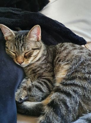 Bonjour, moi c’est Apou (parce que je reviens de loin, et qu’un Apu est un puissant dieu de montagne !), petit mâle de 6 mois. Ma vie a failli s’arrêter dans un bosquet, où j’étais allongé, agonisant, seul, malade et n’ayant pas mangé depuis longtemps. Oui, ça prenait une mauvaise tournure. J’ai été miraculeusement trouvé par une petit truffe de chien en promenade et j’ai passé 10 jours en soins chez une vétérinaire, sous perfusion car je n’arrivais plus à me nourrir, le Coryza ayant eu raison de mes dernières forces. Je me suis battu, car je sais qu’une belle vie m’est possible. De ces premières semaines à la rue, et car le typhus m’a aussi brièvement rendu visite, je garde un léger déséquilibre moteur du train arrière. Ce n’est pas cela qui m’arrête, bien au contraire, je suis une vraie fusée, même s’il m’arrive de trébucher ou de me prendre des meubles. Ma famille d’accueil trouve que c’est rigolo et mignon, même si elle a parfois peur que je me blesse. Mais moi je vais bien ! Quand je suis arrivé chez ma famille d’accueil, je ne pouvais pas faire 3 pas sans tomber, je ne pouvais pas sauter sur son lit alors je me hissais avec mes pattes avant, j’ai toujours trouvé des solutions, et puis surtout j’ai repris de forces, et j’ai un peu grandi aussi. Je suis encore malade du coryza, mais cela va un peu mieux. Peut-être que j’aurai de temps en temps besoin que vous me soigniez, mais je suis un costaud ! D’ailleurs, en parlant de ça, je suis un peu bourrin il paraît. C’est-à-dire, moi j’ai un besoin impressionnant de vous faire des bisous en venant frotter mon nez et ma bouche contre les vôtres. Alors oui, c’est humide, et oui parfois quand je suis malade ça peut paraître désagréable, et oui il est vrai aussi qu’il m’arrive d’être un peu intense, mais tout cela part d’un vrai élan d’amour. Je cherche une famille qui acceptera de se laisser embrasser à ma façon, et qui comprendra que je ne puisse retenir un éternuement même en plein câlin. Je laisse encore des traces de mes éternuements, mais j’espère qu’avec le temps ce sera moins fréquent. Parfois la nuit j’ai besoin de dormir très très près de vous. J’adore dormir sur le visage de ma famille d’accueil, qui tant bien que mal me déplace avec beaucoup de douceur de quelques centimètres. Je reviens assez vite et assez peu discrètement et dès que je suis près d’elle, je me laisse tomber. Parfois je rampe, c’est plus discret. Je sais aussi dormir seul, surtout si vous avez un plaid douillet qui traîne, ou un fauteuil confortable près d’une fenêtre. J’adore jouer aussi, même si je m’essouffle un peu avec ce nez encore pris. Je suis encore un bébé mais je ronfle déjà comme un vieux matou ! Je suis un foufou, je fais des sauts de cabri, parfois je pars dans mon monde et je peux sembler inquiet ou triste, mais dès que l’on me rassure je reviens à la réalité et je continue le jeu et les câlins. Je peux rester seul en journée, je ne suis pas rancunier, mais j’apprécie aussi beaucoup de passer du temps avec ma famille d’accueil, jouer, me blottir sur le canapé pas loin voire directement sur elle (surtout si elle a son plaid !). Je ronronne tout le temps. Je suis un gourmand aussi, mais je reste mince ! J’ai 6 mois, 6 mois d’une vie déjà bien intense, physiquement et émotionnellement. Aujourd’hui je veux égayer votre quotidien, et rencontrer la personne qui me comprendra et prendra soin de moi, dans un environnement calme et heureux. Une personne qui connaît déjà bien mes compatriotes félins, et qui sera douce. A cause de mon léger déséquilibre, la vétérinaire préfère que je sois en appartement. Ma famille d’accueil est disponible pour vous donner plus de détails sur notre vie ensemble, elle me dit sans cesse qu’elle m’aime et elle m’appelle « mon petit cul », j’ai longtemps cru que c’était mon prénom.