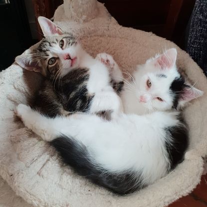 Sirop, petit mâle tigré et blanc, et sa soeur Shy, blanche et noire à poils mi-longs, attendent la famille qui saura les aimer.