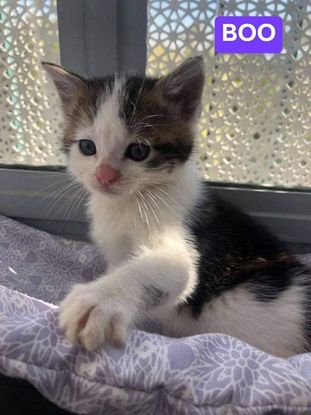 BOO 2 mois et demi, est le plus câlin de sa fratrie. Très affectueux, il aime se poser sur les genoux ou les épaules des humains et il s’endort dans les mains, le tout en ronronnant. Boo est aussi très joueur avec ses frère et sœur et ne sort pas les griffes en jouant avec les personnes. Il n’est pas timide et vient toujours se mettre sur les genoux des personnes qui viennent le voir. Il a une petite blessure (qui partira) et il se laisse soigner sans souci. C’est un super petit chaton dont sa nouvelle famille tombera facilement amoureuse !