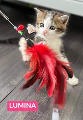 LUMINA 2 mois et demi est une jolie et adorable petite minette qui est aussi joueuse que câline. Elle aime se mettre sur le dos, que ce soit en jouant ou sur les genoux et dans les mains des humains où elle ronronne et s’endort toute allongée. Elle est toujours partante pour une partie de jeux avec les personnes et/ou ses frères et elle aime particulièrement grimper en haut du griffoir. Elle ne sort jamais les griffes ou les dents en jouant. C’est le petit chaton idéal dont la nouvelle famille sera ravie !