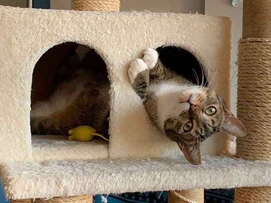 Elle aime grimper en haut de son arbre à chat où elle observe le monde avec intérêt