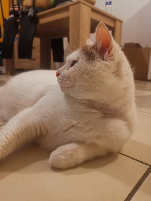 De nature très calme et pantouflard, adepte du canapé il a vite apprécié le confort du lit et la chaleur d'un foyer.