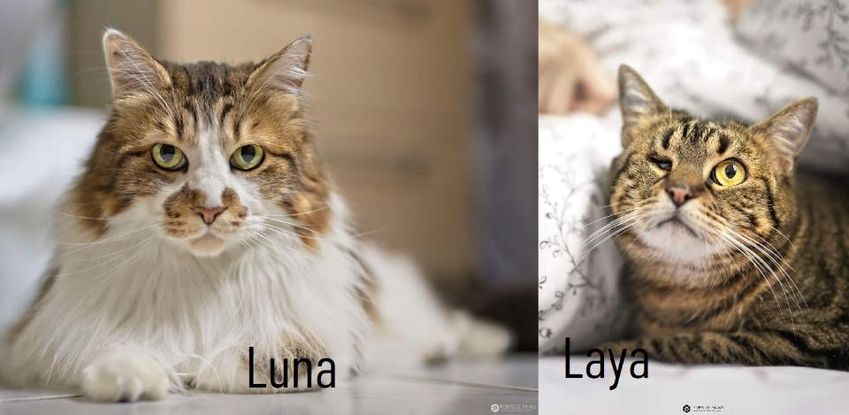 Luna et Laya sont assez calmes et dorment beaucoup mais aiment grimper dans leur arbre à chat et jouer avec tous leurs jeux (balles, laser, plumeau etc.)![]()