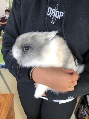 Panpan est un lapin nain mâle à poils mi-longs gris et blancs. Il est très affectueux et câlin et se montre adorable avec les enfants. Il se laisse porter et caresser. Son contact avec les humains est vraiment facile.