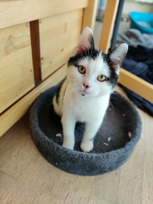 Foxtrot est un mâle noir et blanc d'environ 6 mois (né le 03/06/2021).