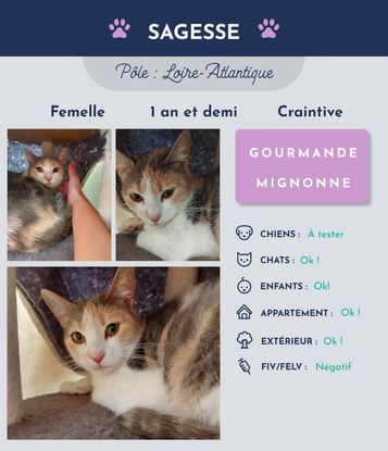 Moi c'est Sagesse, une petite femelle toute douce, mais pour me caresser il faut venir en douceur . Je peux paraître méchante quand je crache, mais en fait j'ai surtout peur...