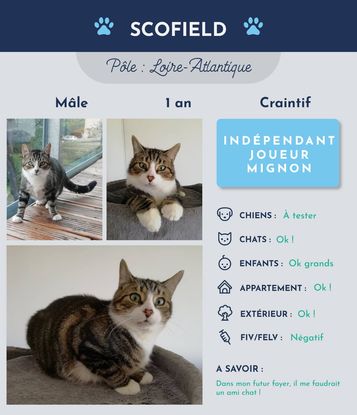Je m'appelle Scofield, j'ai 1 an et quelques mois. j'ai un beau pelage tigré symétrique, avec le ventre, le menton et les chaussettes blanches. Je communique en roucoulant. Mon humain trouve que j'ai beaucoup de classe.