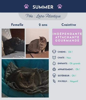 Bonjour je m'appelle Summer et je suis une jolie minette âgée de presque 2 ans. De nature très réservée, je ne viens pas facilement vers vous. Je peux rester cachée à vous observer pendant quelque temps avant de sortir de ma cachette.