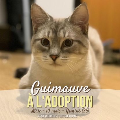 Guimauve a été recueilli quand il était encore chaton sur un site de prolifération. Il est né loin des humains et a eu besoin de temps pour se laisser approcher et câliner. Aujourd'hui il a beaucoup moins peur et s'est habitué aux gentilles attentions des humains. Il reste un peu timide mais sait venir demander des câlins et s'installer sur les genoux lorsqu'il a envie d'avoir de l'attention. Dès que les câlins démarrent, il se transforme en boîte à ronrons.