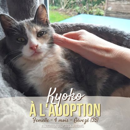 Kyoko a été recueillie cet hiver avec sa maman Kaori et sa sœur Azami. Alors que sa maman est très câline et proche de l’homme, Kyoko ne connaissait les humains que de loin, elle était peureuse au début et ne se laissait pas toucher. Aujourd’hui elle a beaucoup changé : c’est une chatonne joueuse et ronronneuse. Elle est encore un peu timide avec les humains, mais se laisse approcher, prendre dans les bras et caresser.