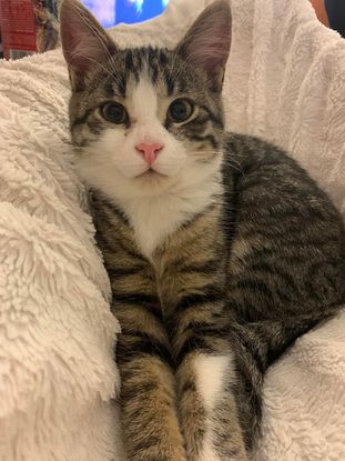 Stockholm est un mâle tigré et blanc d'environ 3 mois (né le 15/09/2021).