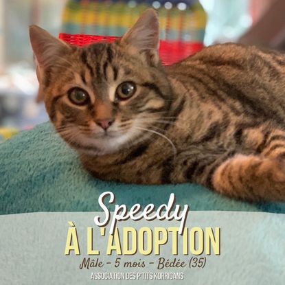 Speedy est un chaton plein de joie et d'énergie, toujours partant pour un câlin, un jeu avec les humains, une ronronthérapie ou une grosse partie de folie avec un ou plusieurs copains chats.