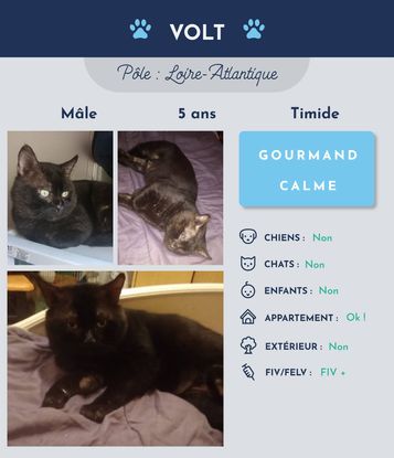 Chalut moi c’est Volt, un chatounet de 5 ans. Je suis assez timide, surtout quand je ne connais pas les humains qui m’entourent.
