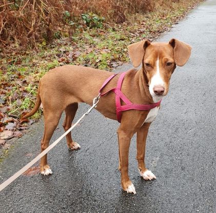 Kloé est une petite chienne typée Podenco de petit/moyen gabarit (10kg).