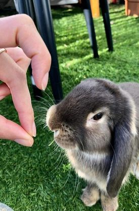 Petit lapin bélier mâle de 7 mois, c’est un vrai rayon de soleil! Il est sage, propre, très gourmand et adore les caresses. Au vu de son jeune âge il est fougueux et dynamique. Il adore jouer avec le chat de sa famille d’accueil et il recherche également le contact avec l’humain.