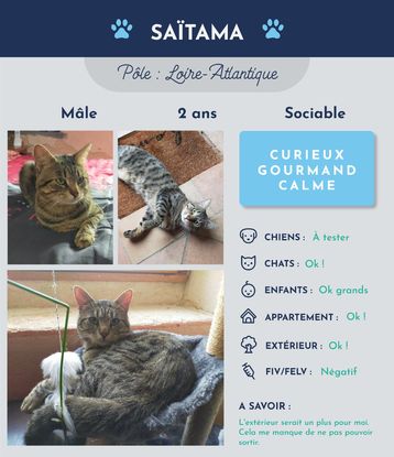 Je m'appelle Saïtama, je suis un chat mâle de 2 ans qui apprécie la compagnie.