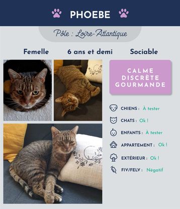 Coucou, moi c'est Phoebe ! Je suis une femelle de 6 ans calme, douce et discrète.