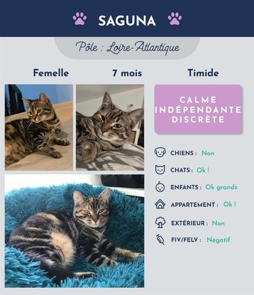 Bonjour ! Je m’appelle Saguna, un prénom indien qui signifie « doté de vertus ». Je suis née le 21 juin 2021, j’ai donc 7 mois. J’ai été trouvée avec mes 3 frères et ma maman. Je suis timide de nature et assez indépendante ; Je ne viendrai pas spontanément vers vous car la main de l’homme me fait encore peur. Ce n’est que dans des moments calmes que je me laisse caresser... Par contre, je viendrai volontiers dormir au pied du lit, proche de vous. J’adore d’ailleurs jouer avec les pieds sous la couette. Mon passe temps favori est de faire de longues siestes blottie dans un panier confortable et poilu !