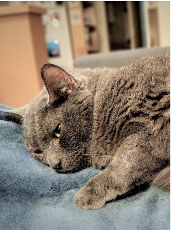 Très calme, elle est habituée à vivre en appartement, et n'a jamais vécu avec d'autres animaux. Elle est toujours curieuse avec les inconnus et se laisse caresser facilement. Sa grande passion, c'est de venir faire la bouillotte sur vos genoux !