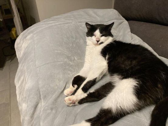 Safty rentre donc en FA le 18/11/21, ne montre aucune agressivité, son corps est totalement déformé tellement il est dénutri. Une fois libéré dans une pièce, les ronrons commencent mais il a une peur bleue de l'humain et ne pense qu'à une chose, manger et manger encore.