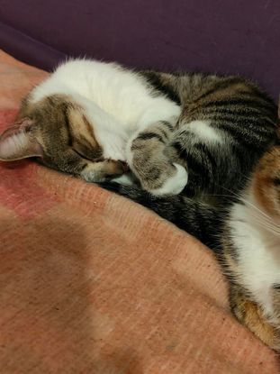 Olivette, elle a 3 ans, elle adore ses congénères et le chien, elle dort très souvent avec lui. Elle a bien pris possession des lieux et s'est beaucoup épanouie. Très câline, un peu craintive, elle passe ses journées sur le canapé.