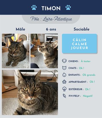 Je suis Timon, un chat adulte tigré d’environ 6 ans.
