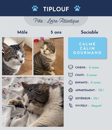 Bonjour ! Je m'appelle Tiplouf et je suis un mâle d'environ 5 ans. J'ai un caractère très doux et calme. Je ronronne très facilement quand on me caresse, et je sors la langue systématiquement ! J'ai longtemps connu le monde extérieur, mais je vis maintenant en appartement, même si l'air frais me manque un peu. J'aime beaucoup la présence humaine et ne dis jamais non à des câlins ! J'ai hâte de trouver enfin ma famille pour toujours.