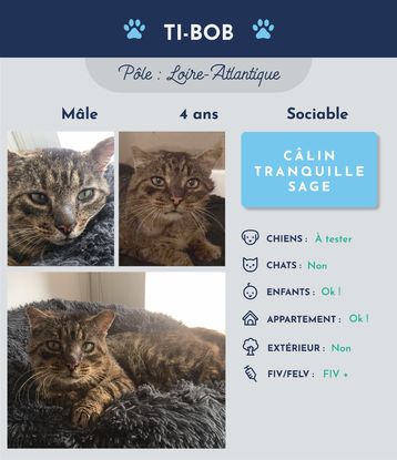 Miaou ! À vous qui venez de cliquer sur mon annonce, moi c’est Ti-Bob ! Une grosse boule de poils de bientôt 4 ans… oui, je suis un mâle si vous vous posez la question et oui, j’ai eu une autre vie avant. Aujourd’hui je suis à la recherche d’une famille formidable pour couler des jours heureux.