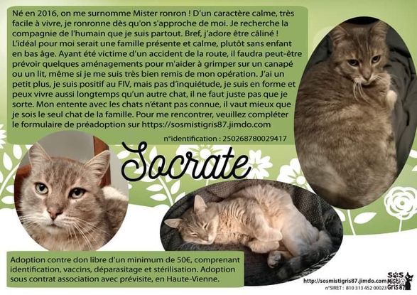 Né en 2016, on me surnomme Mister ronron ! D’un caractère calme, très facile à vivre, je ronronne dès qu'on s'approche de moi. Je recherche la compagnie de l'humain que je suis partout. Bref, j’adore être câliné ! L’idéal pour moi serait une famille présente et calme, plutôt sans enfant en bas âge. Ayant été victime d’un accident de la route, il faudra peut-être prévoir quelques aménagements pour m'aider à grimper sur un canapé ou un lit, même si je me suis très bien remis de mon opération. J’ai un petit plus, je suis positif au FIV, mais pas d’inquiétude, je suis en forme et peux vivre aussi longtemps qu’un autre chat, il ne faut juste pas que je sorte. Mon entente avec les chats n’étant pas connue, il vaut mieux que