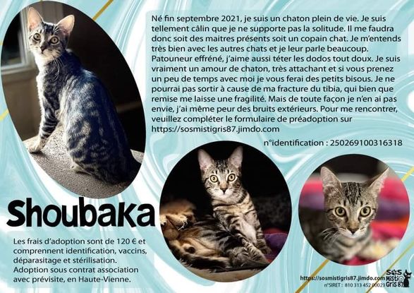Né fin septembre 2021, je suis un chaton plein de vie. Je suis tellement câlin que je ne supporte pas la solitude. Il me faudra donc soit des maitres présents soit un copain chat. Je m’entends très bien avec les autres chats et je leur parle beaucoup. Patouneur effréné, j’aime aussi téter les dodos tout doux. Je suis vraiment un amour de chaton, très attachant et si vous prenez un peu de temps avec moi je vous ferai des petits bisous. Je ne pourrai pas sortir à cause de ma fracture du tibia, qui bien que remise me laisse une fragilité. Mais de toute façon je n’en ai pas envie, j’ai même peur des bruits extérieurs. Pour me rencontrer, veuillez compléter le formulaire de préadoption sur https://sosmistigris87.jimdo.com