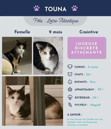 Bonjour ! Je m’appelle Touna, je suis une petite chatte d’à peine un an avec un beau pelage tricolore.
