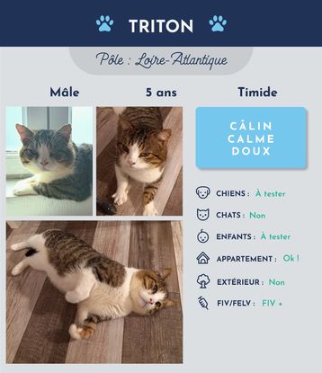 Coucou je suis Triton, un beau minou de 5 ans ! Avec ma famille d'accueil c'est la première fois que je vis dans un appartement et qu'une humaine s'occupe autant de moi. Je n'ai jamais vécu dans une maison mais j'étais souvent avec des humains, je n'ai donc pas peur d'eux. Même si je suis timide de prime abord, dès que je suis à l'aise, j'adore les câlins, me frotter et me rouler quand on me fait des caresses. Je suis très affectueux et toujours demandeur de papouilles !