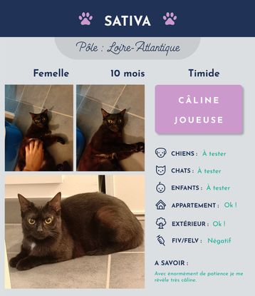 Coucou ! Je m’appelle Sativa, je suis une chatte européenne âgée de 10 mois.
