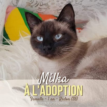 Milka adore les câlins et les gratouilles, elle reste proche mais ne vient pas sur les genoux et n'aime pas être portée, elle est très joueuse et raffole des chaussettes qu'elle emmène dans ses mutliples cachettes