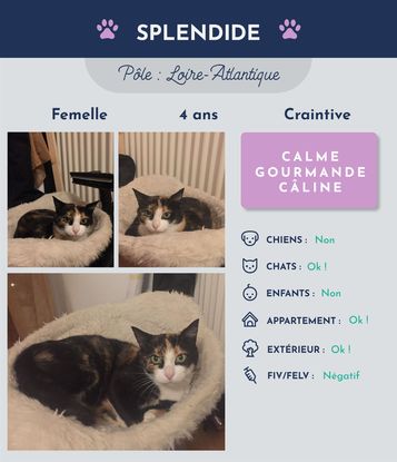 Je suis une jolie chatoune de 4 ans et demi, tricolore, stérilisée.