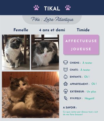 Coucou ! Moi c’est Tikal, petite femelle de 4ans et demi. J’ai été abandonnée car on ne pouvait plus s’occuper de moi. Aujourd’hui je suis un peu craintive et je me méfie beaucoup des autres chats mais je suis toujours à la recherche du contact des humains qui m’entourent ! Ça me prend un peu de temps pour me sentir à l’aise mais une fois que c’est fait, j’adore me frotter contre vos jambes, recevoir des gratouilles sur la tête ou encore dormir à vos pieds.