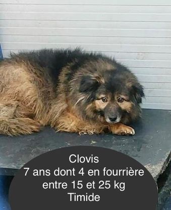 Clovis a été enfermé dans la sinistre fourrière de Mihailesti (Bucarest) après avoir été capturé par les "dogcatchers", agents des fourrières payés par le gouvernement roumain pour "nettoyer" les rues des chiens laissés à l'abandon. Né en avril 2015 (date estimée approximative), son pelage mi-long est marron mordoré ponctué de noir, il est de taille moyenne (15 à 25kg).