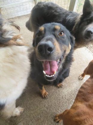 Né en avril 2020 (date estimée approximative), c’est un croisé de 25 à 30 kg environ, au pelage noir et feu et de tempérament plutôt calme et timide.