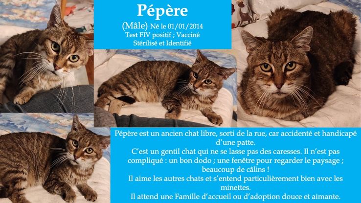 Pépère est un ancien chat libre , sorti de la rue, car accidenté et handicapé d'une patte. C'est un gentil chat qui se ne lasse pas des caresses. Il n'est pas compliqué: un bon dodo , une fenêtre pour regarder le paysage, beaucoup de câlins!! Il aime les autres chats et s'entend particulièrement bien avec les minettes. Il attend une famille d'accueil ou d'adoption douce et aimante.
