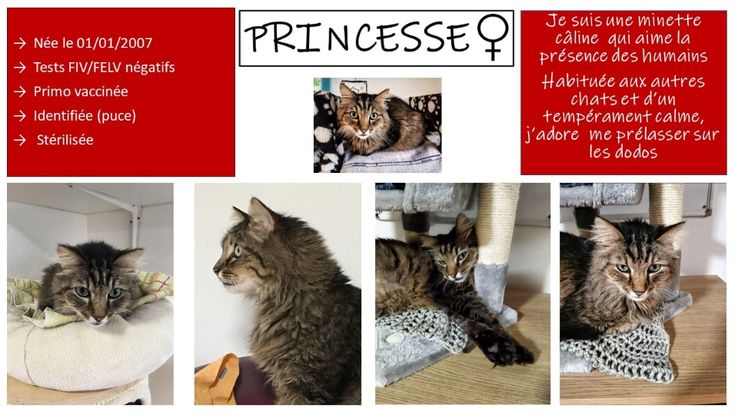 Princesse porte bien son nom! minette câline qui aime la présence des humains. Habituée aux autres chat et d'un tempérament calme, elle adore se prélasser sur les dodos.
