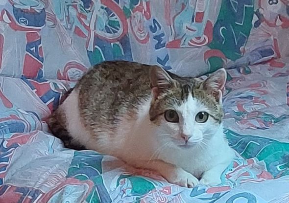 Très timide au départ, la voici bien plus détendue et en recherche de caresses grâce au travail de sa famille d’accueil. C’est devenue une vraie machine à ronron qui va s’installer sur les genoux dès qu’on s’assoit sur le canapé.