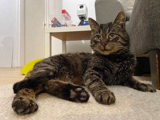 Après des années à l’abandon avec une quarantaine de chats, m’initier à la vie en maison a été un peu difficile, mais je me suis bien adapté ! Très craintif à mes débuts, j’ai encore peur des gestes brusques et des bruits un peu forts, comme celui de l’aspirateur ou des sacs plastiques.