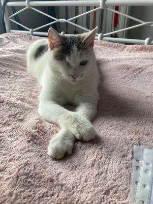 Recouverte d'hématomes et l'oeil fortement atteint, elle a d'abord été soignée pendant plusieurs semaines, opérée à deux reprises (stérilisation / énucléation) et enfin vous est proposée à l'adoption.
